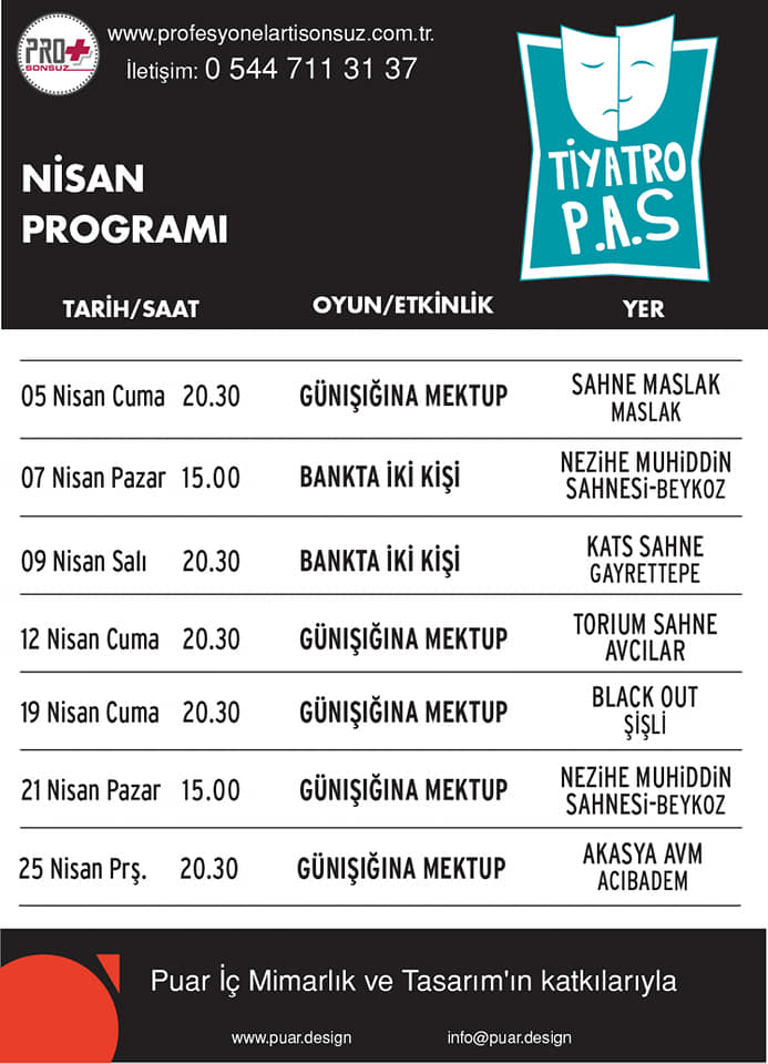 TİYATRO P.A.S. NİSAN PROGRAMI Yazan:Editör31 Mart 2019Yazı kategorisi GenelEtiketler:Etkinlikler, nisan, Tiyatro PAS Bunu paylaş: X'te paylaş (Yeni pencerede açılır) X Facebook üzerinde paylaş (Yeni pencerede açılır) Facebook Beğen Yükleniyor... İlgili